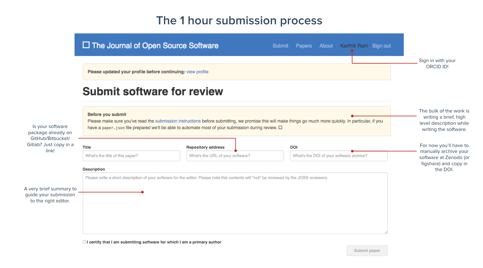 Enter the Journal of Open Source Software (JOSS). Any research software engineer developing software with a research application (the only scope limitation of the journal), will need to write a high level description of what the software does, along with brief descriptions of potential applications. This paper should be no more than 2-3 pages long and include a few influential citations. So the only noticeable change to a software engineer’s workflow will be to develop this paper.md as part of the software development process. That’s it!